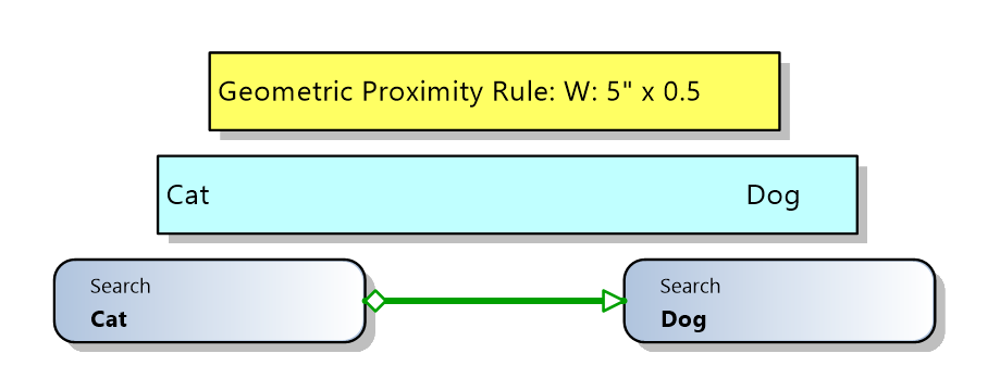 A geometric proximity rule can be applied between two searches, constraining the search area from the input search for the area of the output search. Region(s) can be specified relative to the input search, and priority of the regions can be determined in the ordering. Other fields like allowing overlap and finding the closest result can be adjusted. If there are multiple regions looked at once, beware of using the and operator.